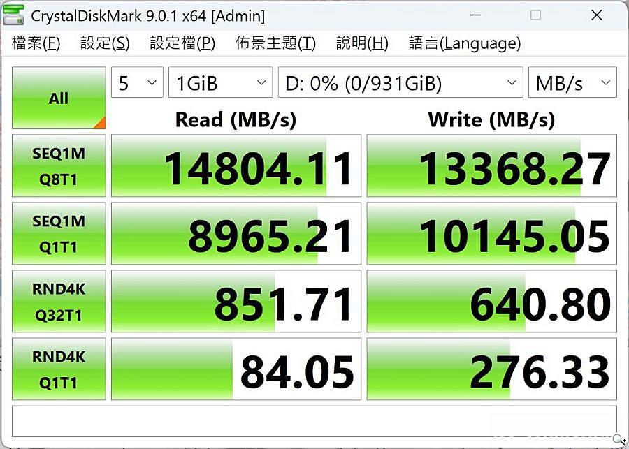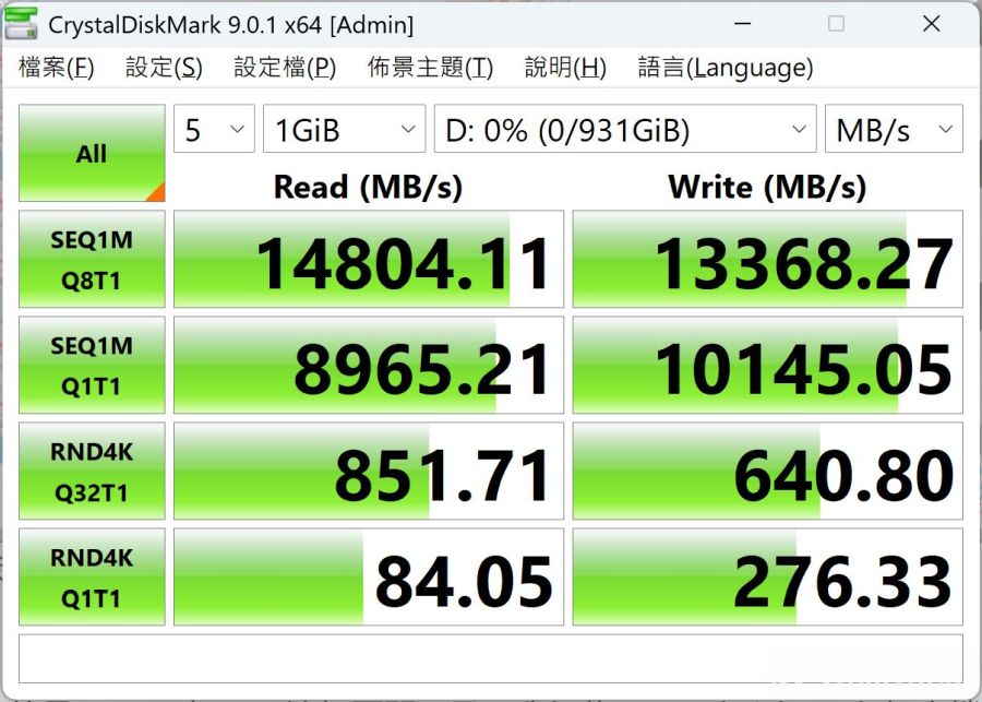 軟體預設以1GiB檔案容量進行測試,獲得連續讀寫速度約為14804MB/s及13368MB/s。