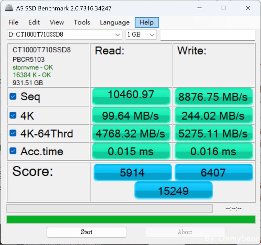 預設以1GB大小檔案進行測試,測得循序讀寫速度約為10,461 MB/s及8877 MB/s,總分15429。