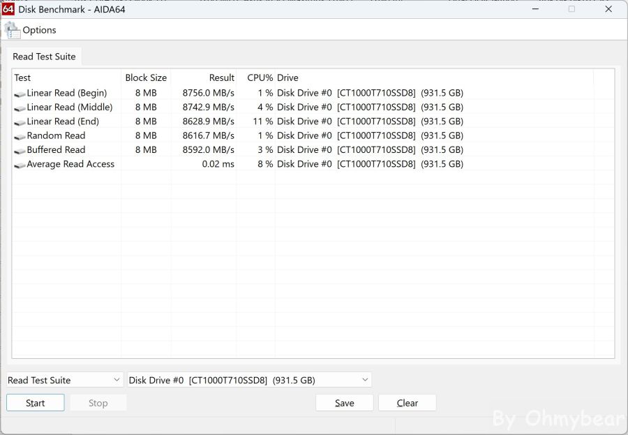 以AIDA64內建磁碟跑分Read Test Suite項目進行測試,循序及隨機讀取速度約在8592~8756MB/s區間,平均讀取搜尋時間為0.02ms。