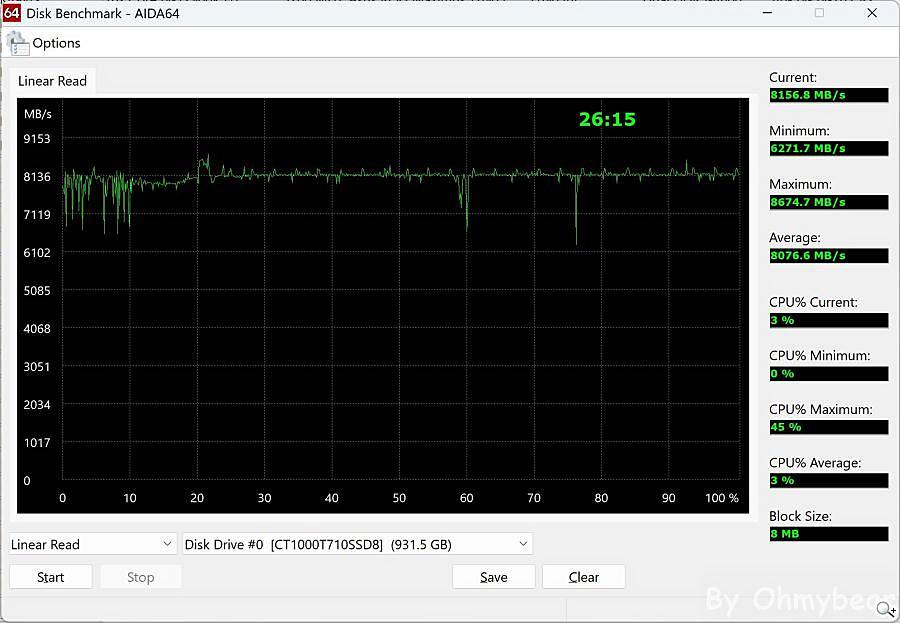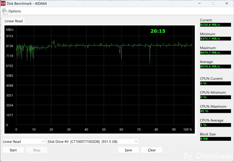 測試前段波動部分可能是因為邊測試邊逛網頁導致(?)最高讀取速度為8674.7MB/s,平均讀取速度為8076.6MB/s,最低讀取速度為6271.7MB/s,如前期波動不計入的話大約於60%時發生降幅。
