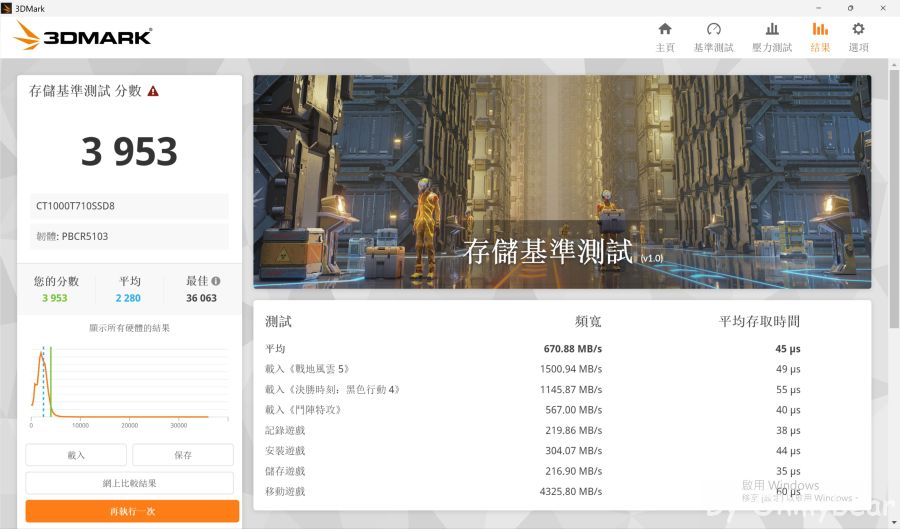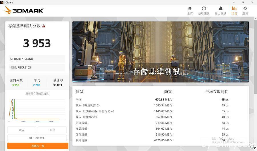 此測試能模擬載入遊戲及安裝遊戲時SSD頻寬,測得平均頻寬為670.88MB/s,綜合總分為3953分。