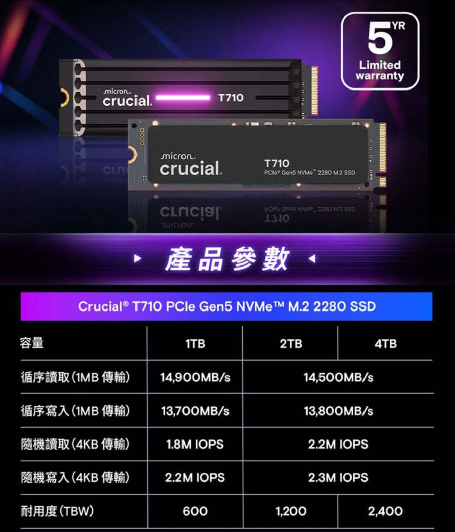 T710是目前美光旗下消費級最新、最快的的旗艦款SSD產品,從T700到T705到T710的路上不斷拉高傳輸速度上限,T710標示循序讀取速度已經來到14900MB/S,幾乎是市售版Gen4 SSD速度的2倍!不斷抬高Gen 5 SSD速度的天花板,看來追求極致效能的玩家又有新玩具啦!