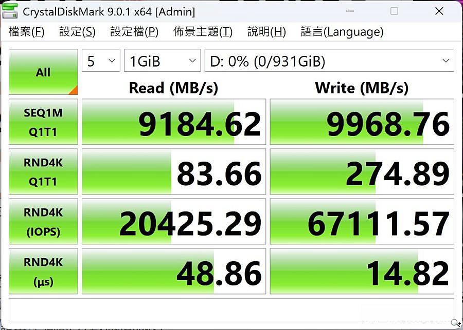 測得連續讀寫速度約為9185MB/s及9969MB/s。