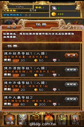 初入城堡時,會有個指導員教學,先針對”結界”進行等級的提升教學。完成這個步驟後,指導員會指引你點擊”任務”鈕,領取獎勵喔!每完成一個任務,就可以獲得一個鑽石!鑽石除了可以用來抽取英雄之外,如果上陣的英雄在戰役中死亡,可以花費 1 鑽石來復活,替英雄增添火力。