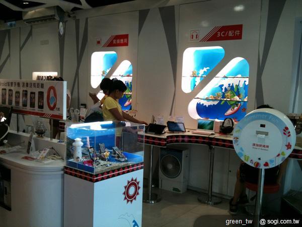 - 花蓮中正直營門市:透過各色 Android 機器人的趣味的結合,展現東台灣特有的原住民南洋風情,讓消費者可以徜徉在蔚藍海洋中,輕鬆享受彈指間的行動樂趣。