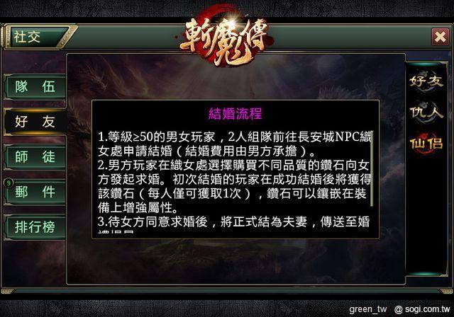《斬魔傳》存在非常豐富的社交機制,玩家們可以選擇認識結交好友,三不五時用郵件互留話增進之間情誼,或者可以共組幫派一同練功打天下,隊伍及幫派都有專屬聊天頻道可以使用。遊戲中的敵對機制也設計相當不錯,在路上隨意 PK 殺掉其他玩家,可是會被納入其仇人名單之中,小心練功時被他人尋仇。最特別的是,如果在遊戲內遇到心儀對象,不妨跟她大膽求婚吧!開啟仙侶模式,出雙入對練功打怪搞不好會有意想不到的收穫喔!