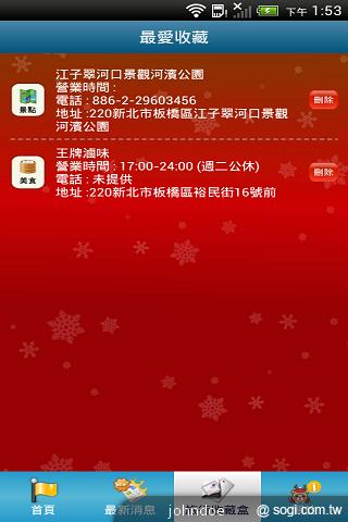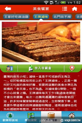 ▲「美食饗宴」同樣先選擇區域,再挑選感興趣的店家查看其詳細介紹內容,同樣提供路線規劃,可收入收藏盒,也可透過 facebook分享給大家。但此功能目前只提供板橋區美食供選擇。