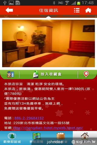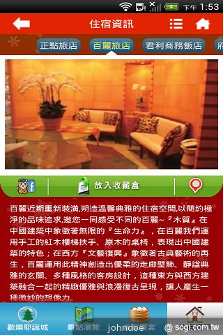 ▲「住宿資訊」功能中同樣先選擇區域,再挑選感興趣的店家查看其詳細介紹內容,同樣提供路線規劃,可收入收藏盒,也可在facebook 上跟大家分享。但此功能目前只提供板橋區住宿店家供選擇。