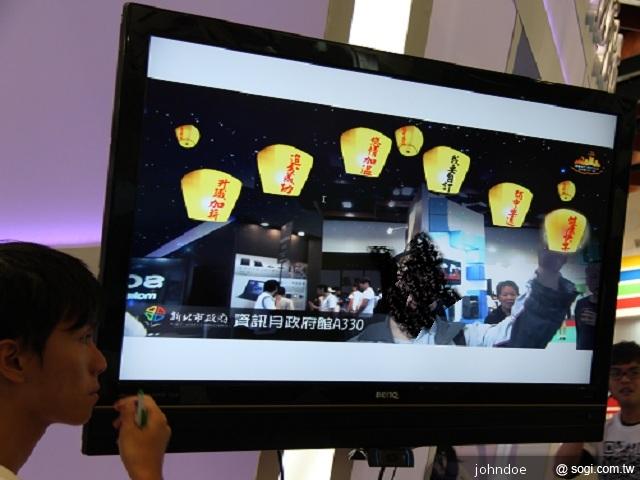 ▲在101 年資訊月中,新北市政府館搭配主題現場,有施放數位天燈活動。民眾可自行選擇想祈福的天燈,利用 AR 擴增實境,讓民眾不用跑到平溪也能放天燈。放完天燈還可拍照留念哦。