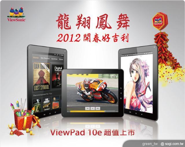 喜愛大螢幕的朋友則可選擇 ViewSonic ViewPad 10e, 10 吋大畫面採用色彩鮮明奪目的 IPS 高畫質觸控面板,僅 0.91 公分纖薄迷人曲線,搭配 ViewSonic 獨家 ViewScene 3D 介面,立體畫面流暢指尖,娛樂更加得心應手。新年入手價 NT$9,990,買就送 16GB SD 卡。