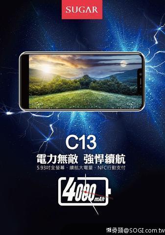 SUGAR C13同級手機唯一擁有NFC行動支付功能,便捷智慧生活,消費輕鬆PAY,大電量4000mAh享受多媒體娛樂不限電,細緻機身設計搭載5.93吋HD+大螢幕,雙主鏡頭4倍慢動作錄影捕捉精采,前鏡頭必備美顏拍照,行動愜意享樂,智慧安全雙解鎖指紋與人臉辨識;超大電力與行動錢包SUGAR C13一次滿足。想了解更多關於SUGAR C13資訊請造訪SUGAR官網。