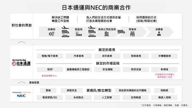 人們對物流精細度的要求與日俱增,為了滿足此需求,日本通運與NEC在2020年10月已展開探索性的價值共創專案,並於2021年簽訂商業合作協議,希望結合日本通運的全球物流網與物流知識,以及NEC頂尖的AI與IoT等數位技術和整合能力來開創新業務,進而解決社會問題,並在打造永續發展的社會過程中扮演重要角色。