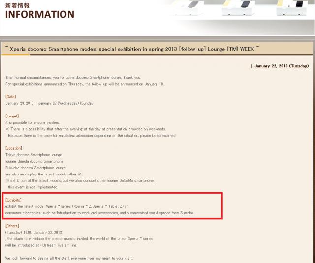 ▲ Xperia Blog 最新消息指出,日本電信商 NTT DoCoMo 預計在 1 月 22 日先透過該 NTT DoCoMo 公司網頁公佈 Sony Xperia Table Z,並將在 1 月 23 日-1 月 27 日期間舉行的特別展會中進行展示。(圖片來源:Xperia Blog)