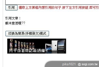 出現頁面:任何版面之文章編輯畫面不好意思,我測試的情況似乎沒有廣告出現不知能否請您提供出現的頁面?..........恕刪