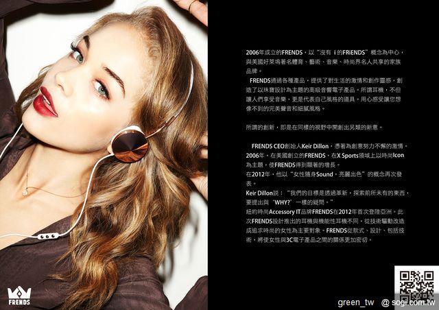 紐約時尚 Accessory IT 品牌 FRENDS 在 2012 年首次登陸亞洲。此次 FRENDS 設計推出的耳機與機能性耳機不同,從技術驅動改造成追求時尚的女性為主要對象。