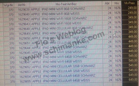 以下是德國媒體曝光的 Apple iPad mini 全部型號和售價: