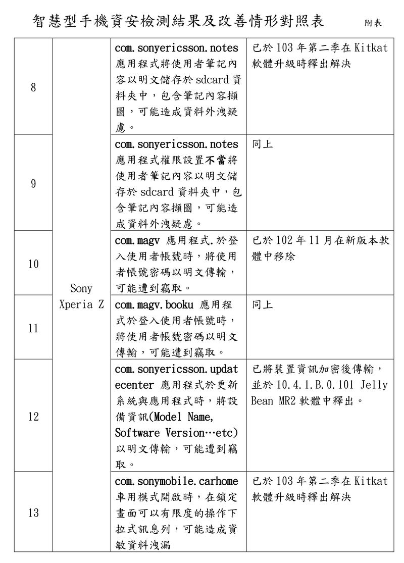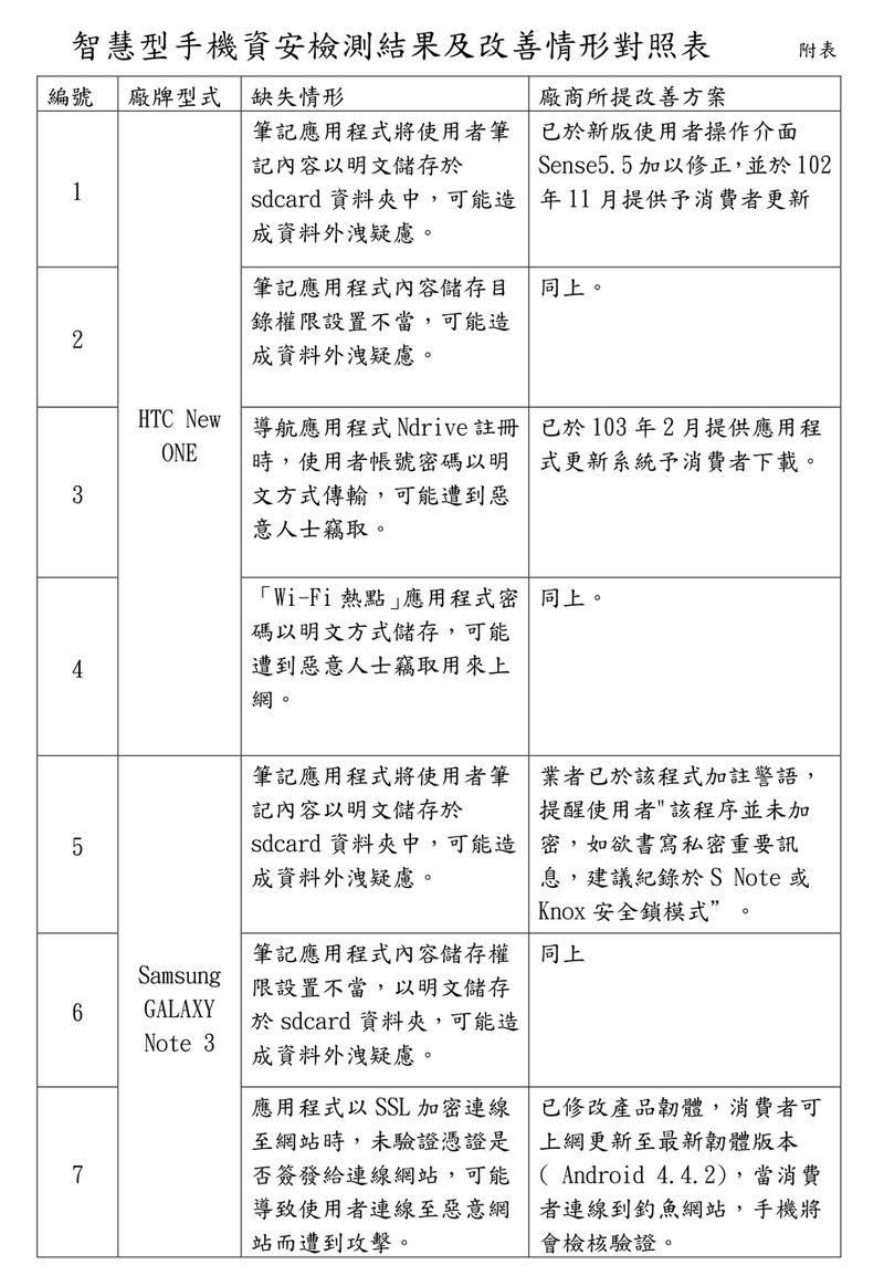 為維護消費者權益,行政院消費者保護處(下稱行政院消保處)針對 HTC New One、Samsung Note 3、Sony Xperia Z 等三款暢銷智慧型手機進行資安測試,測試結果發現 HTC New One 具有 4 項資安缺失 (2 項高風險,2 項低風險)、Samsung GALAXY Note 3 具有 3 項資安缺失 (1 項高風險,2 項低風險)、Sony Xperia Z 具有 6 項資安缺失 (2 項高風險,4 項低風險),經行政院消保處通知業者已請業者全數改善完畢。