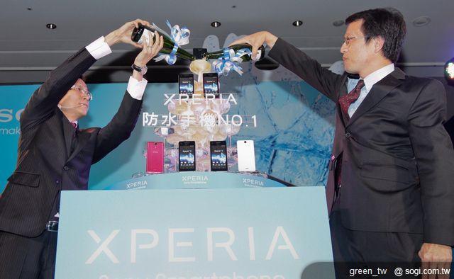 ▲總經理林志遠先生 (右)及行銷總監余俊宏先生 (左)共同慶祝 Sony Mobile 成為「台灣防水手機第一品牌」。