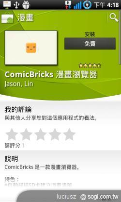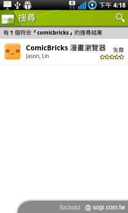▲首先我們需先確認手機可以連上網路,沒問題之後就可以執行 Android Market 搜尋「ComicBricks