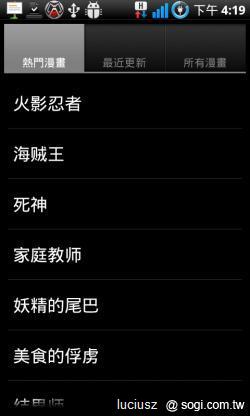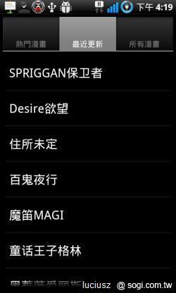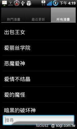 ▲ComicBricks 根據分類提供"熱門漫畫"、"最近更新"、"所有漫畫"三個頁面,如果您找不到想要的可以直接按 MENU 搜尋,不過要打得出簡體字才行 >"<。