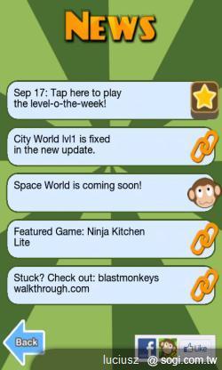 ▲Blast Monkeys 主頁面上有「遊戲」、「新聞」、「幫助」與「賺取 M 幣」圖示。「新聞」看板會釋放出每週關卡讓玩家嘗鮮;並公佈一些開發商的資訊。「幫助」則是教導玩家如何操作大砲與遊戲中常見的輔助物;「賺取 M 幣」則是說明,如何利用 M 幣解除新關卡。