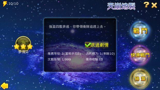 玩家 15 等候開啟,VIP 玩家只要達成三星過關,即可進行快速掃蕩。玩家不只可以在短時間內獲取大量戰利品,享受連續開寶的快感以外,同時快速提升隊伍等級哦。有了掃蕩的功能,練功再也不是件無趣乏味的事,讓你輕鬆享受遊戲沒煩惱。配合新服加開,掃蕩所需的門檻也進行大幅調降。