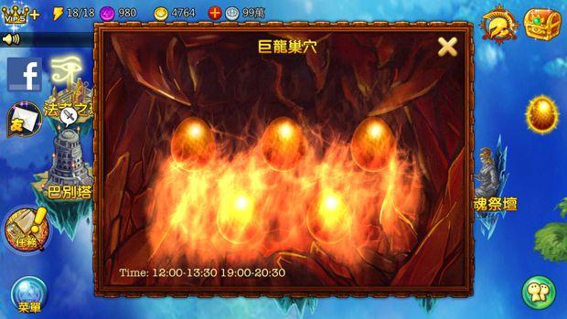 每日中午 12:00 與 18:00,只要一探巨龍巢穴,就可獲得巨型龍蛋,使用後可獲得大量精力。透過這個功能,玩家每日可獲得的精力即將大幅成長。等級成長速度也將大幅提升。