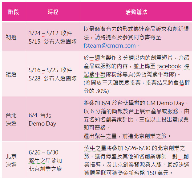 紫牛戰隊於3月24日正式開放收件,五月公布複賽名單後,入選團隊需製作三分鐘以內的影片,上傳Facebook並標註「台灣紫牛戰隊」,獵豹移動將以影片評分、綜合大眾投票分數,選出十組團隊參加6月4日於台北舉辦的「CM Demo Day」,由導師團現場選出紫牛之星團隊(五位評審有三位通過即可入選),前進北京創業之旅,最終有一組可獲得30萬人民幣創業獎金。