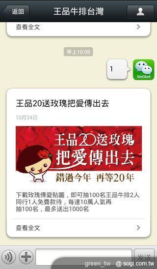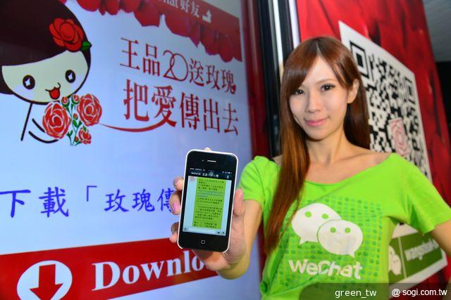 沿襲以往周年慶發送玫瑰花傳遞對人群的關懷與祝福為中心思想,王品 20 周年加以突破創新,鎖定社群微行銷風潮,與全球最大跨商業應用平台 WeChat 結盟,成立「王品牛排台灣」官方帳號 (WeChat ID: wangsteak-TW),同時自創 8 款玫瑰貼圖免費提供下載,利用行動 e 玫瑰與親友分享幸福溫暖,也是餐飲界首度進軍智慧手持經濟的創舉,引領移動潮流先機,宣示其深耕年輕族群與活化品牌的決心,透過時下最夯的貼圖語言,將品牌形象傳遞給「心中最重要的人」!
