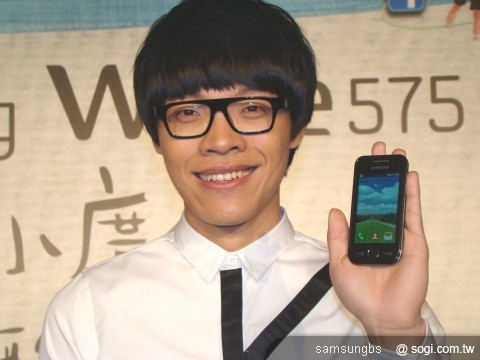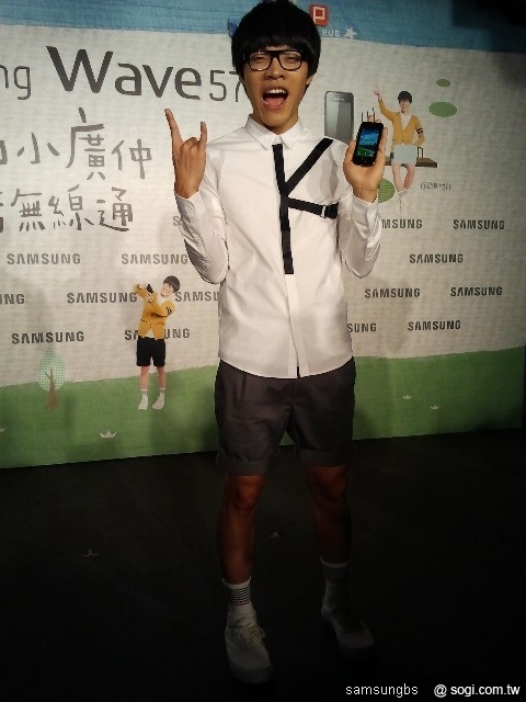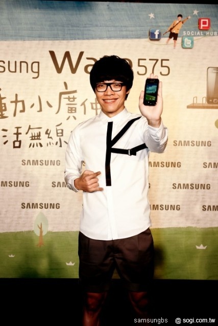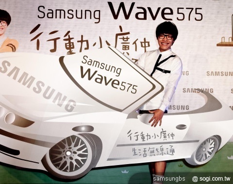 盧廣仲手持最新代言的手機 Samsung Wave 575,化身人群中的「行動基地台」,堅持走到哪都要用行動AP分享網路,隨時都超熱血! (引用自今日報)