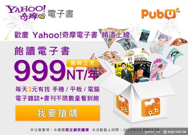 Yahoo! 奇摩電子書在開站 3 天內推出《飽讀電子書》一年 999 元的超優惠特價,換算下來一天只要 2.73 元就能無限閱讀萬本雜誌、電子書,時間只到 8 月 24 日止。