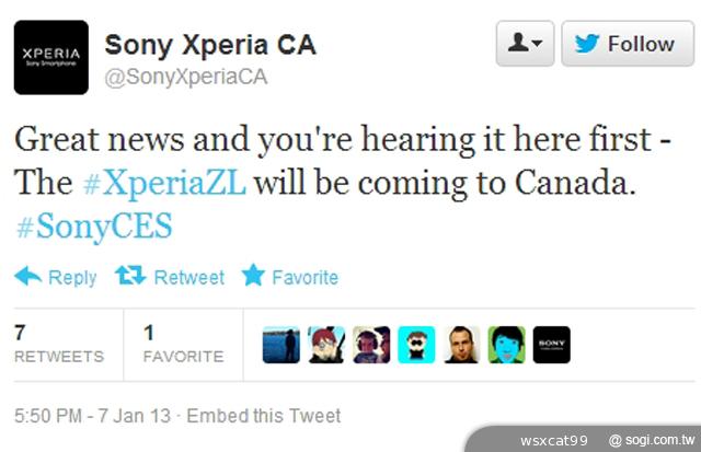 ▲Sony 於其官方 Twitter 帳戶正式宣佈 Sony Xperia ZL 即將登陸加拿大。(圖片來源:Twitter)