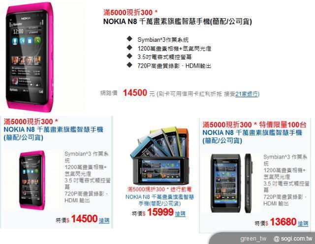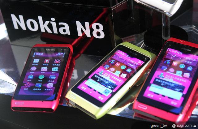Nokia N8 智慧型手機最強 1200 萬畫素相機與卡爾蔡司光學認證鏡頭,寫真生活的每一刻;內建即時影片、相片編輯功能揮灑個人創意;直覺式線上分享功能零時差輕鬆在社交網絡散播個人魅力,加上 USB On-The-Go 功能,可即時透過 USB 隨身碟儲存與分享檔案,享受 Nokia N8 所帶來的便利體驗。Nokia N8 全系列共六款繽紛色彩,建議售價新台幣 17,980 元。