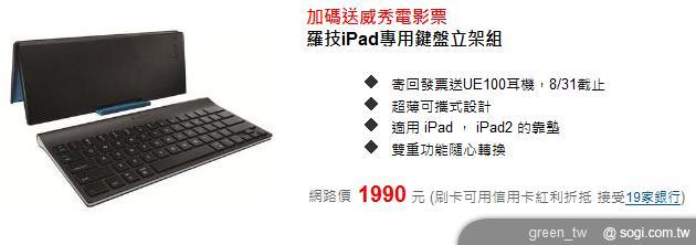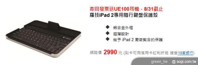 羅技 iPad 2 專用隨行鍵盤保護殼,提供一年有限硬體保固,產品建議售價為 NT$2,990 元;羅技 iPad 鍵盤立架組,提供三年有限硬體保固,產品建議售價為 NT$1,990 元,即日起至 8 月底前購買羅技 iPad 2 專用隨行鍵盤保護殼或羅技 iPad 鍵盤立架組乙組,可免費獲贈 Ultimate Ears100 耳機乙組(價值 NT$490,顏色隨機出貨),更多產品訊息及活動方式,請洽羅技官方網站 http://www.logitech.com.tw。