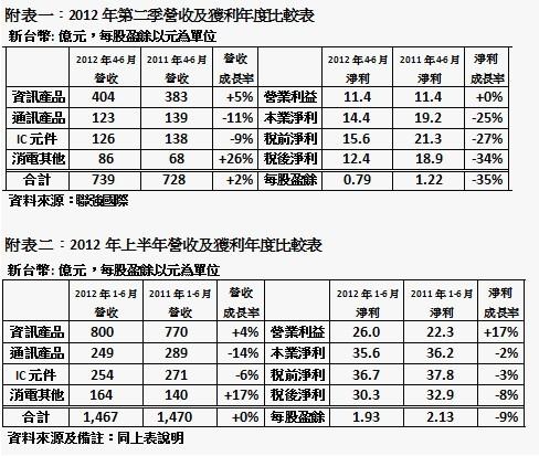 累計上半年合併財報:合併營收為1,467億元,略低於去年的1,470億元。營業利益為26億元,較去年同期的22.3億元成長17%。稅前淨利為36.7億元,略低於去年的37.8億元;其中,合計營業利益及認列印度、美國及泰國、印尼等本業合資事業的利益,本業稅前淨利為35.6億元,略低於去年的36.2億元。稅後盈餘為30.3億元,較去年的32.9億元下滑8%。若依加權平均流通在外股本157億元計算,2012年上半年每股稅後盈餘為1.93元。