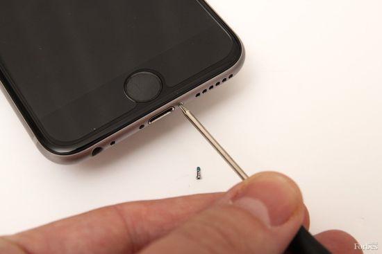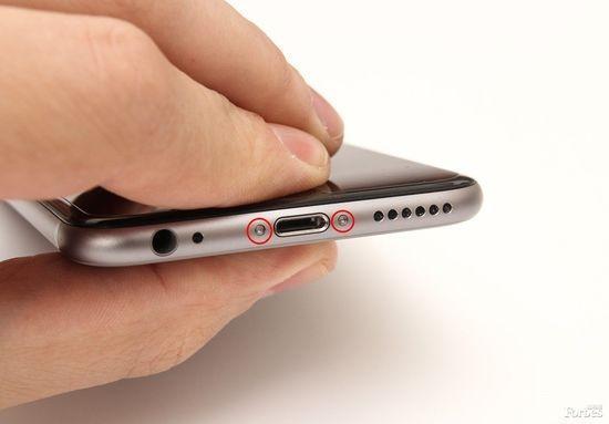 第2步:找到手機充電口兩側的兩顆五角形螺絲,然後擰開旁邊這兩顆螺絲就可以打開iPhone 6了哦。