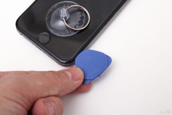 第4步:使用吸盤在主頁鍵(Home)上方拉出螢幕。把吸盤固定在Home鍵的正上方,另一隻手握住機身,然後往外拉。你只需要在螢幕和機身之間撬開足以塞進一個塑膠片的空間就可以啦。
