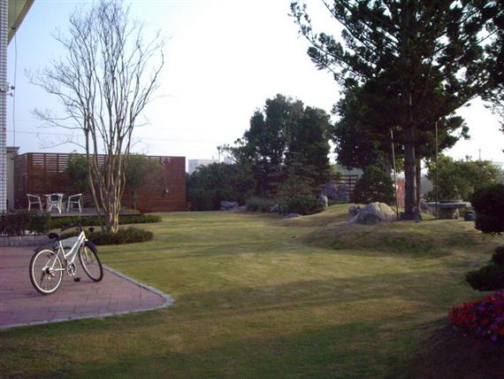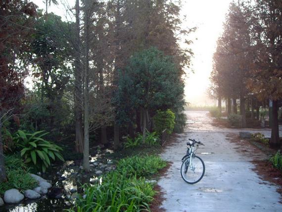 第二天一大早(六點多),為體驗鄉間特有的早晨,天還未亮時,太陽尚未露臉,晨間隱約有著薄霧,和老婆二人騎著民宿提供的鐵馬,二人先到前花園"菁芳園"再次欣賞另一番風情,接下來便隨性而悠閒的在田尾的鄉間小路上漫遊…