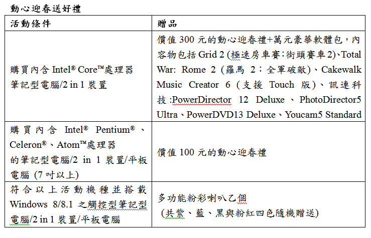 若購買指定品牌且搭載 Intel Core 處理器的筆記型電腦或 2 in 1 裝置,即可獲得價值 300 元的動心迎春禮以及價值超過萬元的豪華軟體包。若購買指定品牌且搭載 Intel Pentium 、Celeron 或是 Atom 處理器的筆記型電腦、2 in 1 裝置或平板電腦(7 吋以上),則可獲得價值 100 元的動心迎春禮。除此之外,凡購買以上活動機種並搭載 Windows 8/8.1 之觸控型筆記型電腦、2 in 1 裝置或平板電腦,則加贈多功能粉彩喇叭乙個 (共紫、藍、黑與粉紅四色,採隨機贈送)。贈品數量有限,贈完為止。
