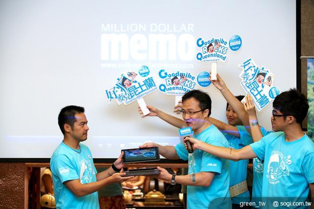 (8 月 18 日,台北訊)華碩入選澳洲昆士蘭旅遊局舉辦「百萬大賞備忘錄 - 世上最好公司」徵選活動前二十強,創意影片更榮登網路人氣第一名,在華碩參賽代表「好麥克」即將遠赴澳洲,參加「終極挑戰賽」的歡送記者會上,華碩設計總監楊明晉特別贈送好麥克一樣獨家法寶 - 華碩變形平板,希望好麥克能利用其完善的功能在各項競賽中贏得先機。變形平板裡並錄製了一段華碩大家長施崇棠先生給好麥克加油打氣的影片,當施董事長喊出 Go! GoodMike Go! 的時候,好麥克感動之情油然顯現在臉上。