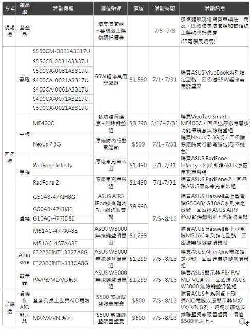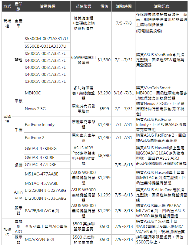 多媒體展期間,消費者凡於現場購買華碩任一商品,即贈精美清潔組及華碩線上購物網折價券;回函禮好康則包含:購買 ASUS VivoBook 指定型號,回函即送 65W 輕薄萬用變壓器(市價 NT$1,590);購買 VivoTab Smart ME400C 指定型號,回函送原廠專屬多功能保護套無線鍵盤組(市價 NT$3,290);購買華碩桌上型電腦 G10、G50 系列指定型號,回函送 ASUS AIR3 iPod 多媒體喇叭 + 網路收音機(市價 NT$8,990); 購買 ASUS PadFone2、PadFone Infinity 變形手機,回函即贈 ASUS 原廠車充車架組(市價 NT$1,490)。