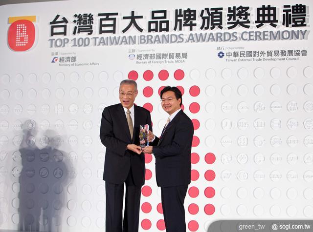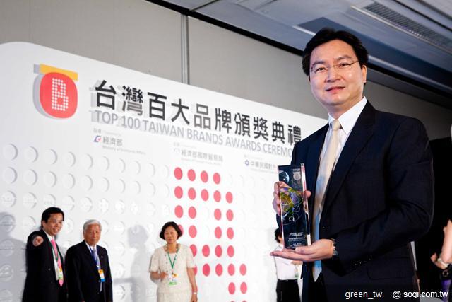 ▲華碩總經理林福能(右)從行政院長吳敦義(左)手中接過百大品牌獎盃。
