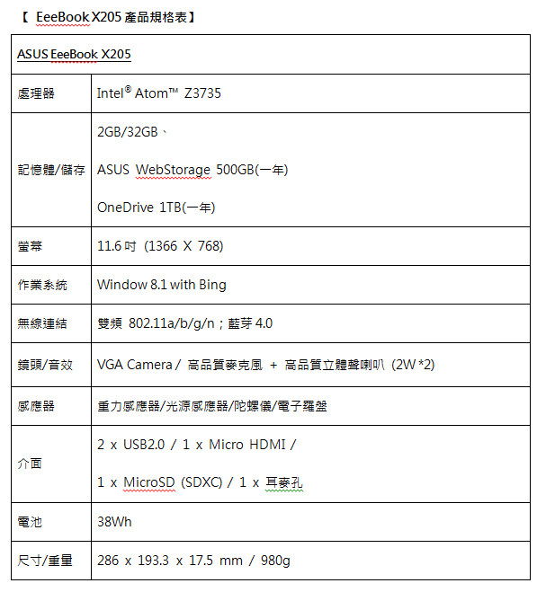 EeeBook X205 採用最新 Windows 8.1 with Bing 作業系統並預建一年版 Microsoft Office 365,使用者可隨心所欲進行即時文書處理。內建 32GB 儲存空間,還可搭配 Micro SD 記憶卡插槽最高擴充 64GB,並加贈一年 ASUS WebStorage 500GB 及 OneDrive 1TB 的雲端儲存空間,資料儲存不再受限於單一硬體,不論資料備份存取或影音儲存分享,皆暢行無阻。建議售價 NT$6,680。