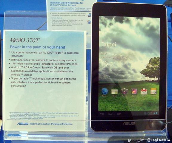 會場上,沈執行長也同時發表華碩第一款七吋四核心平板 MeMO 370T(Wi-Fi 版)。搭載四核心 NVIDIA Tegra 3 處理器,讓平板發揮極致效能;配備八百萬畫素相機,方便使用者隨時隨地留下美好畫面;178 度超廣角 IPS 面板,分享畫面更輕鬆。