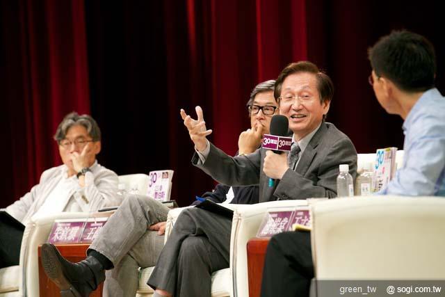 ▲華碩電腦董事長施崇棠(右二)出席兩岸青年創新論壇,與當代創意鬼才金星娛樂總經理王偉忠(左二)及 DC 國際設計公司總經理朱欽騏(左一)對談交流,創意火花不斷。(右一為主持人王文華)