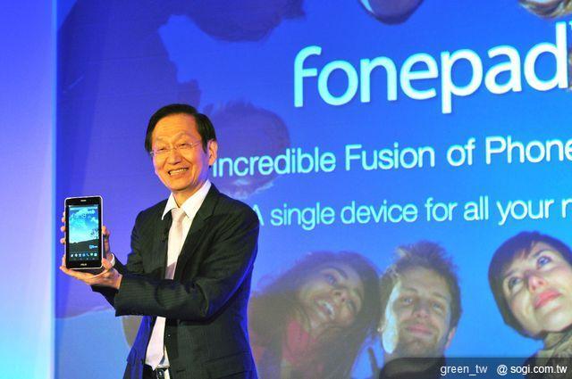 ▲董事長施崇棠於巴塞隆納 MWC 記者會上發表 7 吋可通話平板 Fonepad。