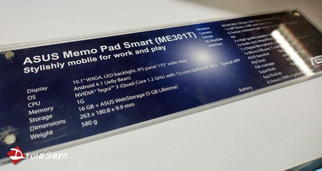 網路盛傳華碩旗下新款平板 ASUS MeMo Pad 10(網傳型號)會在 2 月下旬舉行的 MWC 2013 世界移動通信大會發表,不過該設備日前意外現身於泰國 Mobile Expo 移動世博會,型號為 ASUS MeMo Pad Smart ME301T。該平板運行 Android 4.1 Jelly Bean 作業系統,外觀採用 10.1 吋 IPS 觸控螢幕,內建 NVIDIA Tegra 3, 1.2 GHz 四核心處理器,1GB RAM / 16GB ROM,支援 microSD 擴充同時還贈送 5GB WebStorage 免費存儲空間,配置 500 萬畫素相機與 120 萬畫素前置相機,提供白、藍、粉紅三種款式。ASUS MeMo Pad Smart ME301T 在泰國地區售價定為 10,900 泰銖(約新台幣 10,786 元),目前暫無在台上市資訊。