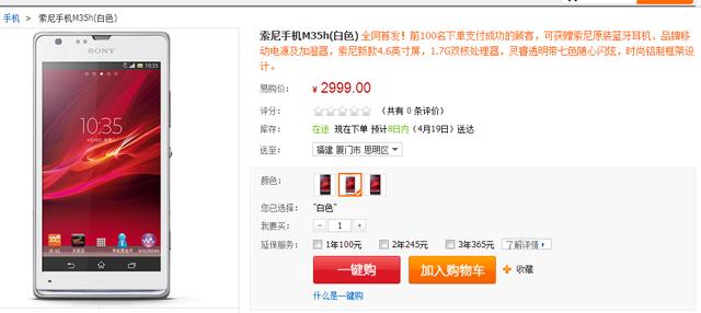 ▲中國線上商城蘇寧易購,已經釋出支援中國聯通 WCDMA 網路制式的 Sony Xperia SP M35h 的預購頁面,提供黑、白、紅三色可選,空機售價為 2,999 元人民幣(約台幣 14,509 元),成功預購者可於 4 月 19 日拿到該機,並且前 100 名預購支付成功的消費者,可獲贈索尼原裝藍牙耳機、品牌移動電源及加濕器。(圖片來源:蘇寧易購)