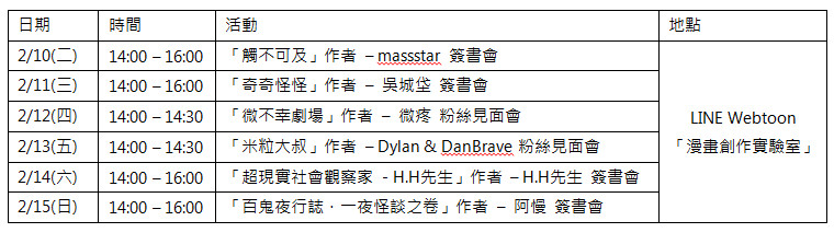 除了 2/10 與 2/14 兩天上午的精采舞台活動,為了讓 LINE Webtoon 的忠實讀者能玩得盡興,團隊於展覽期間特別邀請知名連載作家,連續六天下午舉辦粉絲見面會或簽書會,讓粉絲們能與作家近距離互動,並完整收藏人氣作家們的親筆簽名,台北國際動漫節 LINE Webtoon 活動場次如下: