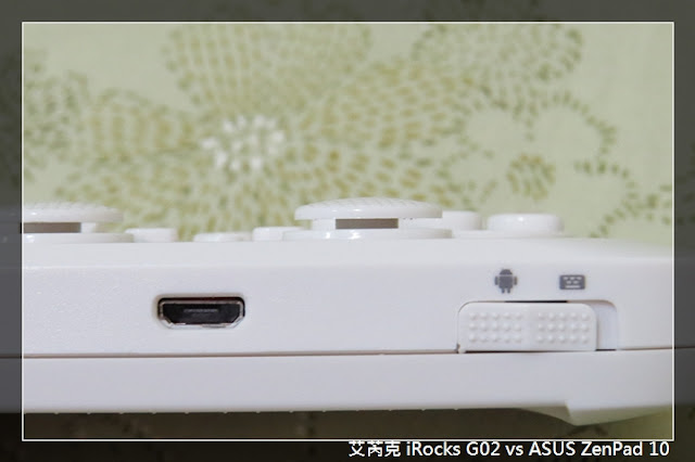 ▲艾芮克 i-Rocks G02 類比方向鍵與手柄的距離約為一張信用卡的厚度,正下方有一個Micro-USB的充電孔。